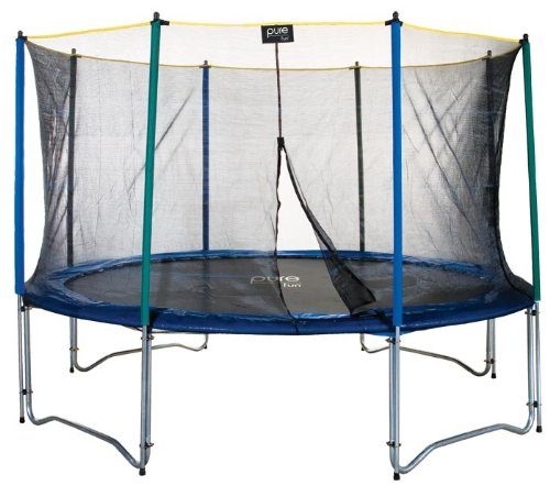 With a Pure Fun 13 Ft Trampoline and Enclosure Set, your family will jump safely. All Pure Fun outdoor trampolines are safety rated up to 250 lbs so that each member of the family can hop with confidence. This trampoline is built with heavy duty galvanized, rust resistant steel and patented T-Section no-weld construction for extra stability and added frame life. T-Section construction keeps the whole trampoline frame from shifting over time and prevents the kind of joint stress that can lead to frame failure. The W-Shaped legs with eight balanced contact points ensure that the trampoline will not wobble or tilt, while high performance steel springs provide the ultimate bounce experience. The Jump mat is designed in the USA of weather resistant, high performance polypro material with UV protected webbing straps. It comes with a PVC frame cover and thick foam rail padding over the springs for extra protection. The trampoline is ASTM, TUV/GS, and CE Certified